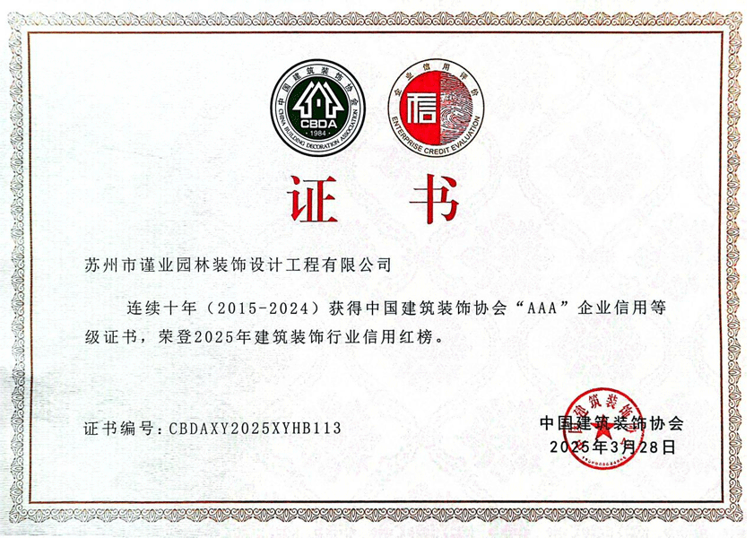 十年間,這顆種子在市場的土壤中生根發(fā)芽,長成參天大樹——?連續(xù)十年(2015-2024)?獲得中國建筑裝飾協(xié)會“AAA”企業(yè)信用等級證書,?榮登2025年信用紅榜?!